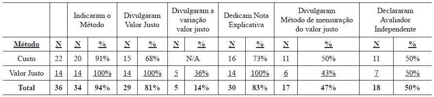 Entre as empresas que optaram pelo método de custo, 68% delas não divulgaram o valor justo de suas propriedades para investimento conforme exigido pelo CPC 28. Destaca-se ainda que seis empresas (27% do total) não divulgaram nota explicativa sobre suas propriedades para investimento conforme determina a norma.