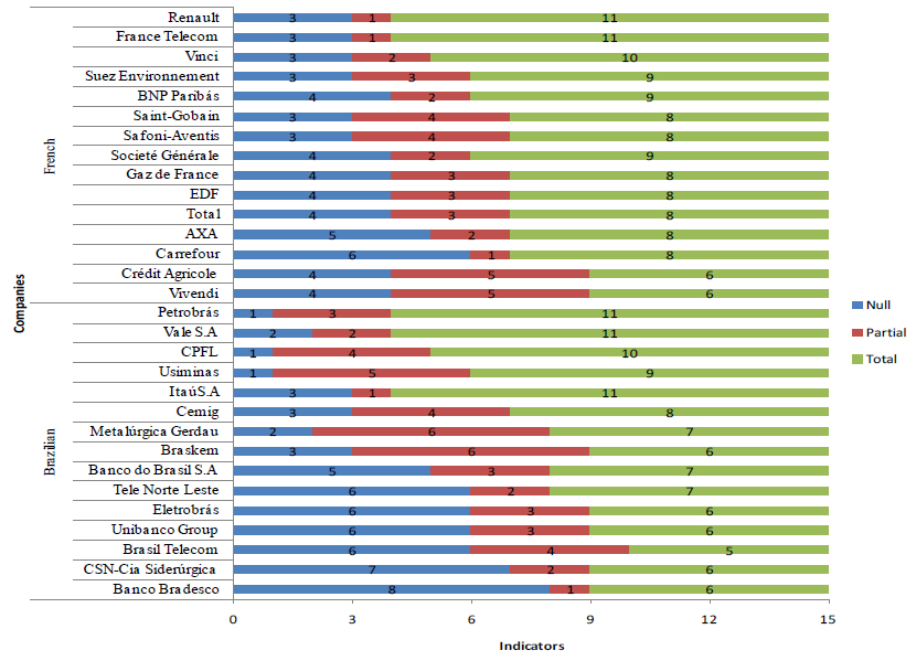 The study was limited by the small sample size (30 companies) and by the diversity in socioeconomic environment (Brazil and France), even if we consider it is enough to present an overview of the social disclosure by the major companies traded in the stock market of the two countries. It would, however, be interesting to conduct studies based on larger samples of companies from a greater number of countries. Likewise, it would be instructive to investigate the correlation between social information disclosure and variables such as economic sector, time of existence and levels of internationalization, indebtedness, regulation and monopoly.