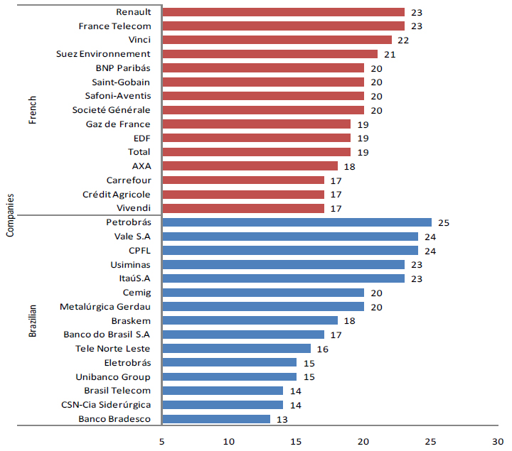 Neither all companies in the ranking of Forbes are listed in the stock market. We choose only listed companies to the sample, that consisted of the top 15 French companies on the Forbes global ranking traded on the stock market of Paris and the top 15 Brazilian companies on the Forbes global ranking traded on the stock market of São Paulo. We consider it is a reasonable amount of companies from each country and we chose to work with publicly traded companies to ensure greater comparability between companies from different countries and because companies tend to have greater visibility and, consequently, offer easier access to social information, thereby increasing the feasibility of our study.