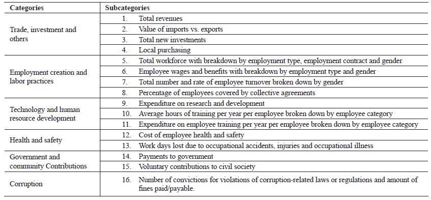To better visualize the data and understand the analysis, Table 1 shows 6 groups (categories of analysis) with a total of 16 indicators of corporate social responsibility (subcategories of analysis), the disclosure of which is recommended by the UN.