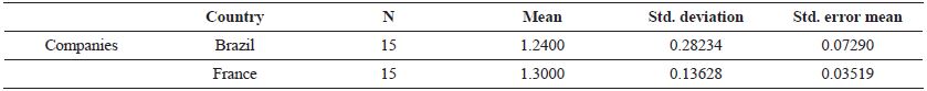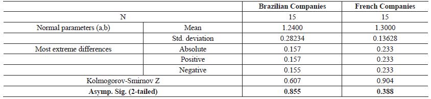 As shown in Table 2, the distribution of the data collected for the variables ‛Brazilian companies’ and‛French companies’ was normal (p = 0.855 and 0.388).
