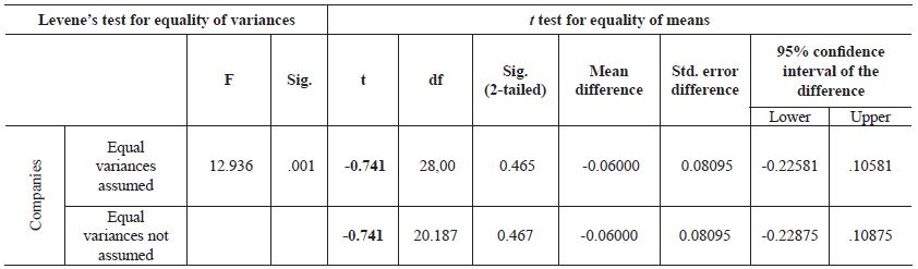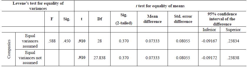 As shown in Table 7, with a Levene’s significance value of 0.450, the t test for equal variances was used. The test value to be interpreted was t = - 0.910. Since the significance was greater than 0.05, the null hypothesis (H0b) cannot be rejected; that is, no statistically significant difference was observed between the largest and the smallest companies with regard to the level of social information disclosure.