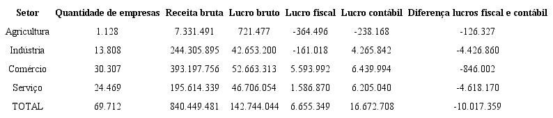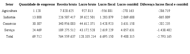 As tabelas 1 a 3 evidenciaram importantes indicadores para economia nacional, retratada pela contabilidade atra- vés da receita bruta, do lucro bruto e dos resultados fiscal e contábil, bem como da dimensão da diferença entre essas duas últimas variáveis.