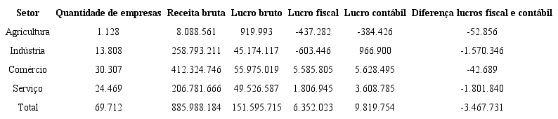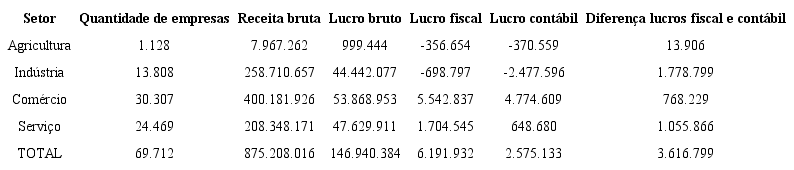 Analisando as variações sob a ótica dos quatro setores, cabe destacar a variação na receita bruta de 20,93% no comércio e de apenas 3,43% na agricultura. A variação negativa de 5,13% no lucro fiscal foi, preponderantemente, produzida pelo setor do comércio, que aumentou 62,9%. Mas a indústria divergiu radicalmente dos demais setores com uma redução de 150,13%.