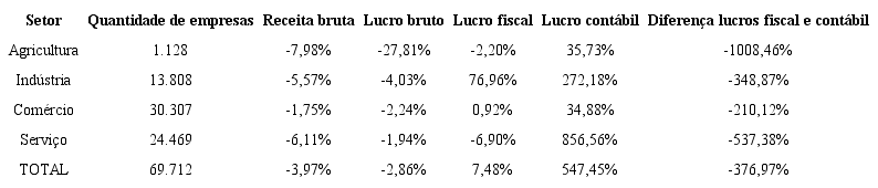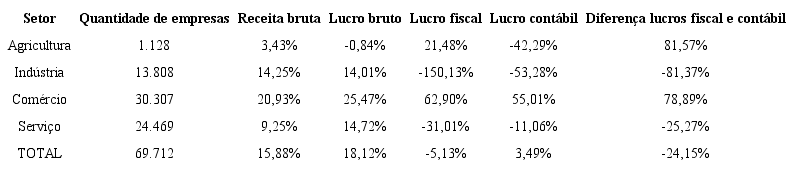 Esses resultados também foram importantes para evidenciar as variações em relevantes indicadores econômicos como a receita bruta, o lucro bruto e os resultados fiscal e contábil, bem como a dimensão da diferença entre essas duas últimas variáveis em menos 24,1%. Isso teve origem no aumento de 3,4% no lucro contábil, que foi superior à variação negativa de 5,1% no resultado tributário.