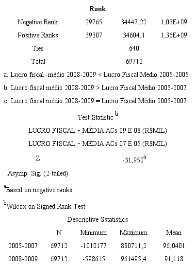No entanto, o teste de Wilcoxon apresentou significância estatística (p-value = 0,000) para justificar que o lucro fiscal médio de 2008-2009 foi inferior ao do período anterior, 2005-2007 (z = - 31,950), conforme tabela 4, a seguir.
