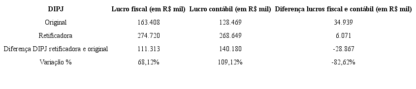A tabela abaixo representa o resultado das retificações da DIPJ promovido pelos 973 contribuintes citados no parágrafo anterior. Apesar de não ter sido possível correlacionar o lucro fiscal com a receita e o lucro brutos (as duas últimas variáveis não foram extraídas da DIPJ original) com o intuito de investigar a evolução da carga tributária, há indícios de que houve redução da base fiscal, pois o resultado fiscal aumentou 60% menos do que o lucro contábil. É apenas um indicador, todavia seria mais robusto compará-lo, também, com a receita e lucro brutos.