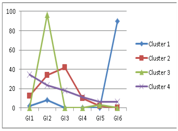 O agrupamento 1 (cluster 1) despontou pela alta avaliação para o indicador GI6, comparado com outros grupos, o que demonstra uma postura de inovação caracterizada pela estabilidade das práticas gerenciais, ou seja, com nenhuma modificação durante o período de pesquisa, com apenas cinco casos.