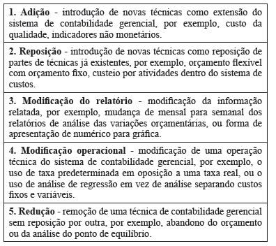 Identificar esses movimentos de mudanças e práticas de controle gerencial é importante, pois pode levantar tendências indicando os movimentos atuais e futuros das organizações em relação às práticas de controle gerencial. Nesse sentido, Sulaiman e Mitchell (2005) desenvolveram uma tipologia para classificar os tipos de mudança de práticas de contabilidade gerencial, classificando-as em: Adição, Reposição, Modificação Operacional, Modificação de Relatório e Remoção. Entende-se que essa tipologia é adequada para identificar os perfis de mudança de práticas de controle gerencial, pois de alguma forma esses estágios podem ser associados à tipologia de inovações classificada como radical ou incremental (DAVILA et al., 2009), além de identificar comportamentos mais direcionados às melhorias contínuas ou mesmo abandono de práticas.