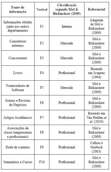 Para coletar dados relativos à variável “Fontes de obtenção de informação”, a maior parte dos itens foi adaptada do estudo de Mol e Birkinshaw (2009). A seguinte assertiva foi colocada aos respondentes:
