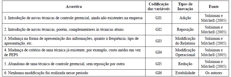 A variável “Tipos de mudança de práticas de controle gerencial” foi operacionalizada a partir do estudo de Sulaiman e Mitchell (2005). Foram incluídos cinco itens que representam diferentes graus de mudança, além de um sexto item que representa a ausência de mudança. O primeiro item representa o mais alto grau de inovação em que são adicionadas novas técnicas de controle gerencial ainda não existentes.