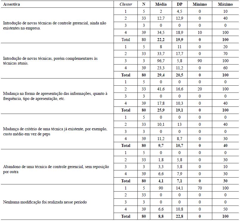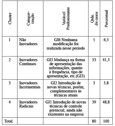 Os resultados são importantes, pois sugerem que há um movimento de inovações de práticas de controle gerencial, práticas estas que não existiam nas organizações até então, uma vez que se somados os dois clusters que representam adoção de inovações e de práticas complementares, chega-se a mais que 50% da amostra. Não é possível afirmar que tipos de inovações estão sendo feitas, mas o que é importante ressaltar é que são técnicas e práticas até então inexistentes nas organizações em que esses profissionais atuam.
