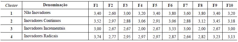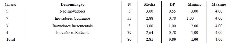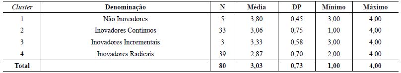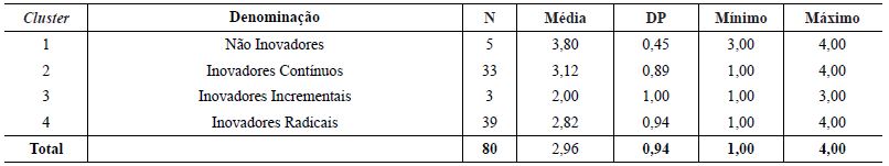 A definição do número de agrupamentos foi baseada no dendograma e este sugere a formação de quatro agrupamentos, os quais confrontando com seis tipos de inovação demonstrados no Quadro 1 podem ser vistos na Figura 1.