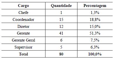 As tabelas a seguir (Tabela 1 e Tabela 2) fornecem informações descritivas sobre os respondentes, enquanto que a Tabela 3 permite o entendimento do porte das empresas em que tais respondentes atuam. Com base nas informações contidas nessas tabelas, pode-se considerar que os respondentes atendem ao perfil desejado para a realização desta pesquisa, tendo em vista os objetivos propostos.