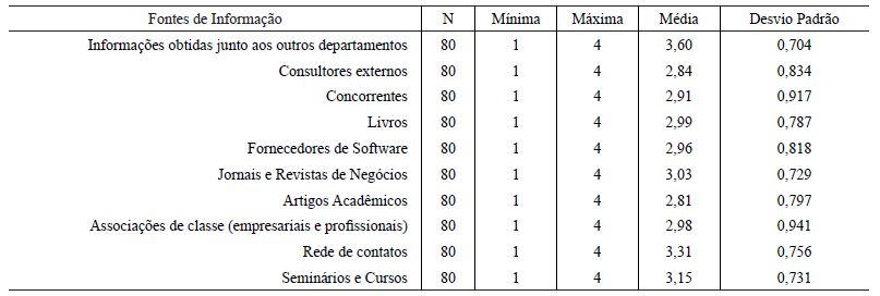 Na tabela 4, são apresentadas as estatísticas em relação às variáveis que compõem o construto “Fontes de Informação”, para em seguida iniciar a discussão dos resultados.