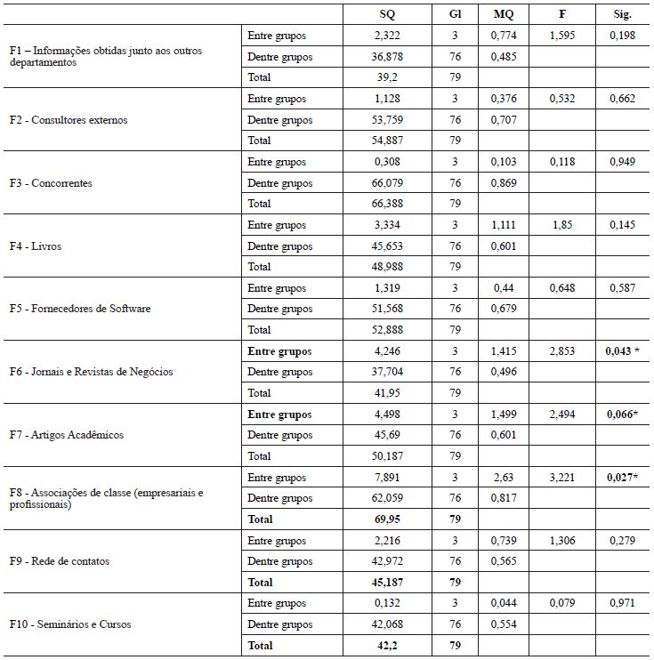Ao realizar esses testes, nota-se que, exceto as fontes de conhecimento F6 (jornais e revistas de negócios), F7 (artigos acadêmicos) e F8 (associações de classe), todas as outras sete tiveram diferença não significativa entre os grupos (P-value > 0,05). Diante disso, pode-se depreender que essas fontes de informação não são determinantes para os tipos de inovação, com os resultados sugerindo homogeneidade para estas sete fontes de informação, ou seja, para estas sete fontes de informação não há qualquer diferença em termos dos perfis de mudança, indicando que outros fatores não investigados neste trabalho poderiam explicar as diferenças de perfis de mudança de práticas de controle gerencial. Dentre esses fatores, pode ser destacado o estágio pelo qual a organização está passando em termos de profissionalização da gestão, inovações organizacionais, perspectivas estratégicas, desempenho etc.