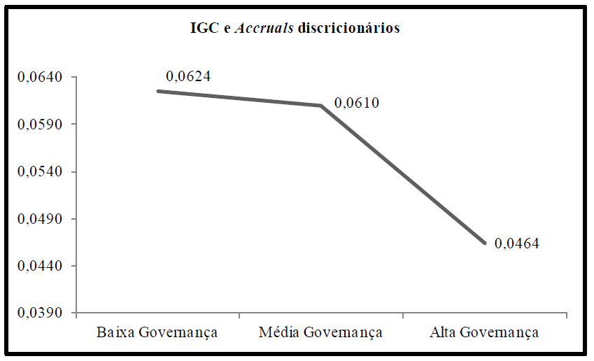 Embora o gráfico não descreva com exatidão a magnitude das diferenças de média da proxy de gerenciamento de resultados entre os três subgrupos do IGC, pode-se verificar que a curva tem desempenho monotônico indicando que à medida que evoluem os Índices de Governança Corporativa, os accruals discricionários também se movimentam e em direção contrária.