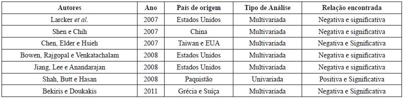 Nesta seção, são apresentados os resultados de pesquisas internacionais que examinaram a associação entre Governança Corporativa e Gerenciamento de resultados, utilizando índices amplos de governança como fator explicativo para o nível de gerenciamento de resultados contábeis.
