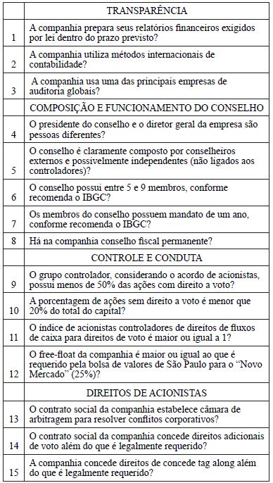 Para mensuração do nível de GC das empresas da amostra, foi utilizado o índice amplo proposto por Leal e Carvalhal-da-Silva (2005) conforme Quadro 2.