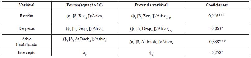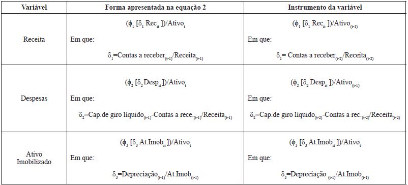 O princípio para o emprego de variáveis instrumentais está em identificar proxies para o vetor de variáveis explicativas (GREENE, 2003). Nesse sentido, proxies são variáveis que, embora estejam correlacionadas com as variáveis independentes, não estão correlacionadas com o termo de erro ε. Encontrar essas proxies indica a remoção da violação do pressuposto discutido acima. Para localizar as VI para as variáveis de Receitas, Despesas e Ativo Imobilizado, foram realizadas defasagens como apresentado no Quadro 2.