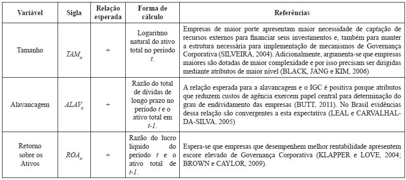 No quadro 4, são apresentadas as variáveis de controle utilizadas com o objetivo de observar sua regularidade de comportamento em relação ao IGC. Mostram-se também referências de estudos precedentes que utilizaram as variáveis de controle incluídas neste estudo em relação à Governança Corporativa.