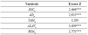 Stock e Yogo (2005) desenvolveram uma tabela de valores críticos para instrumentos fracos. Caso o valor do teste exceda o valor crítico, rejeita-se a hipótese de fraqueza dos instrumentos em questão. Considerando que o resultado do teste estatístico Cragg-Donald foi de 232,61, pode-se concluir que os instrumentos representam proxies adequadas das variáveis preditoras. Diante disso, os coeficientes de regressão utilizados para estimação dos accruals discricionários (AD) são os descritos na Tabela 1. Desse modo, a partir dos coeficientes da tabela 1, podem-se estimar os erros da regressão os quais representam a proxy de gerenciamento de resultados em que maiores níveis de gerenciamento de resultados são estimados por maiores níveis de accruals discricionários (AD) calculados a partir das especificações do modelo KS (2005).
