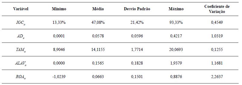 Ainda na tabela 3, observa-se que a variável IGC tem dispersão elevada se comparada com as outras variáveis de pesquisa. Isso é explicado pelo seu método de mensuração ser realizado a partir da ausência ou presença de atributos de governança para cada uma das empresas da amostra. Na tabela 3, o IGC está apresentado na forma de percentual em que a empresa com menor nível de Governança Corporativa tem 13,3% dos atributos do instrumento de pesquisa utilizado e a empresa com maior nível tem 93,33%.