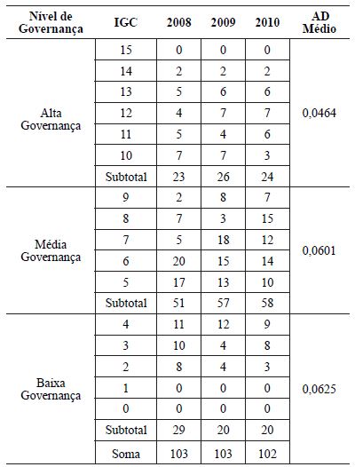 Na coluna “IGC”, está a pontuação em rating nos anos de 2008, 2009 e 2010 e a quantidade de empresas para cada subgrupo.