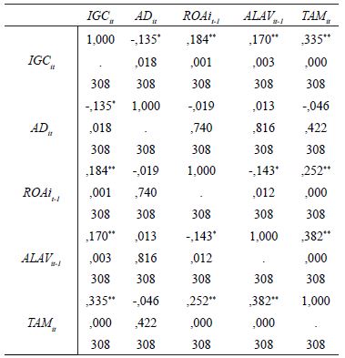 A tabela 5 exibe a matriz de correlações não paramétricas das variáveis de pesquisa e indica associação estatisticamente significativa do Índice de Governança Corporativa e todas as variáveis do estudo.