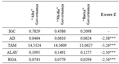 Em continuidade à análise da relação das variáveis do trabalho, na tabela 6, são apresentados os resultados do teste Mann U Whitney de diferenças de médias. Essa tabela tem como objetivo demonstrar diferenças significativas para a proxy de gerenciamento de resultados, tamanho, alavancagem e retorno sobre os ativos, em relação aos grupos de empresas que apresentam “Alta”, “Média” e “Baixa” governança corporativa.
