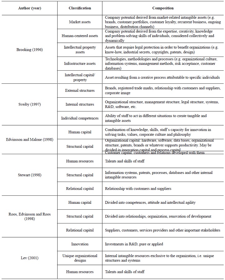 Despite the importance attributed to intangible assets, there is so far no consensus in the literature regarding their classification. Table 1 shows a number of possible classifications.