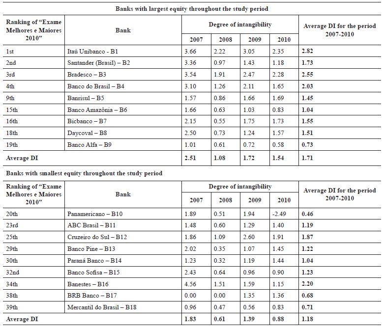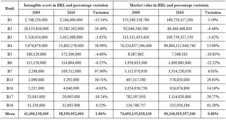 The figures for intangible assets and equity (book value) were retrieved from accounting statements (balance sheet and explanatory notes to the accounting statements) available on the website of BM&FBovespa. The market value of the banks in the sample was retrieved from the database Economática®.