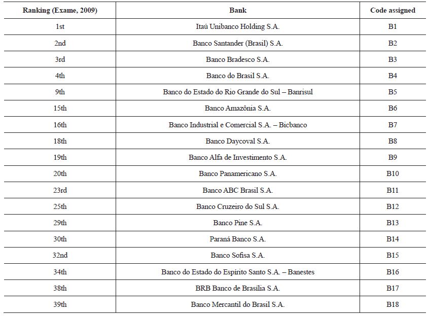 Table 2 shows the final sample of banks analyzed in the study. The left column indicates the position of each bank in the ranking of the largest banks in Brazil (by equity) published in “Exame Melhores e Maiores 2010”. In the right column, we have assigned a code to each institution to facilitate the presentation and discussion of results.