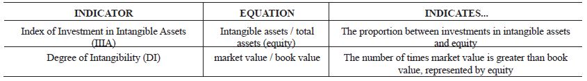 IIIA and DI were obtained using the equations presented in Table 3. The equations have been used in several previous studies on intangibility (KAYO; FAMÁ, 2004; PEREZ; FAMÁ, 2006a, 2006b; COLAUTO et al., 2009; RITTA; ENSSLIN, 2010).