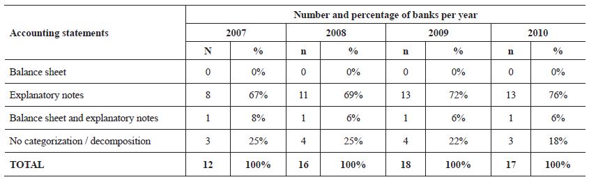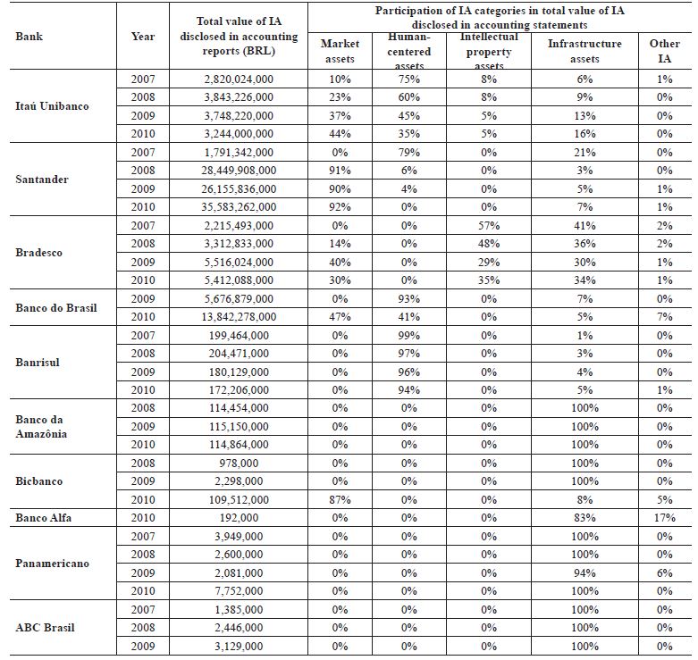 The observed increase in the number of banks disclosing intangible assets and in the practice of segregating assets by category in accounting reports is supported by the findings of Antunes (2006), Reina, Vicente and Ensslin (2008) and Arruda, Cabral and Araújo (2010) who―in addition to quantitative growth― reported qualitative improvements in the reporting of intangible assets of Brazilian firms.