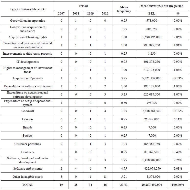 The most representative types of intangible assets were “expenditure on acquisition and software development”, “software and systems” and “acquisition of payrolls” with regard to frequency, and “goodwill” and “acquisition of payrolls” with regard to average amount of investment.
