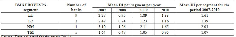 In order to determine whether listing segment was a conditioning factor of DI, we segregated the banks in the sample by BM&FBovespa listing segment and calculated the mean DI of each segment for the period 2007-2010. To calculate the annual segment average we divided the sum of the DI of each year by the number of banks in the segment. The segment average for the entire the study period (2007-2010) was obtained by dividing the sum of the annual segment averages by four (Table 8).