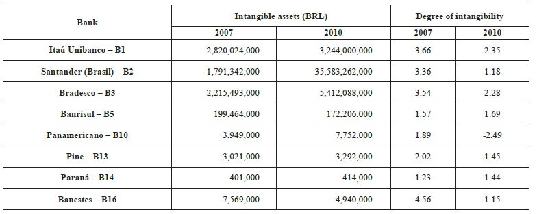 In view of the increase in IT use, networking, e-business, information flow and patent registration and changes in bank management strategies over the past 20 years (QUINTEIRO, 2009), the issue of intangible assets has gained unprecedented importance in the analysis, management and evaluation of financial institutions. This may explain the presence of three (30%) financial institutions among the ten most intangible asset-intensive organizations in Brazil, according to a survey sponsored by The Brander (2009) in partnership with Intangible Asset Management (IAM) Consulting.