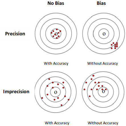 An unbiased and precise estimator is one that identifies values very near the bullseye, with significant accuracy. A precise, but biased, estimator is one that predicts values near each other but far from the correct value. An unbiased but imprecise estimator chooses values are far from each other and that also miss the bullseye, despite being evenly dispersed around it. Finally, a biased and imprecise estimator selects values that are scattered far from each other and miss the bullseye, but are not evenly spaced around it, instead showing a tendency for error in a particular direction. Figure 1 illustrates these concepts.