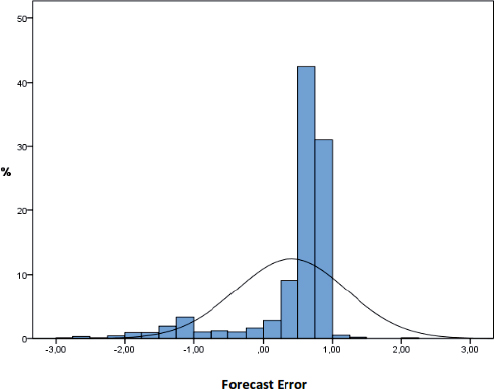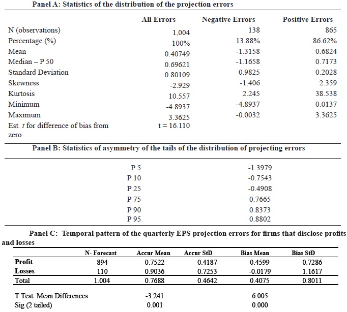 According to Table 1, the data from the analysts’ projections indicate a statistical predominance of positive errors (86.62%) over negative errors (41.22%). Panel A shows the mean of the distribution of the analysts’ projection errors, with a significantly positive value of 0.40749 (t-statistic = 16.110). Likewise, the median is strongly positive at 0.69621.