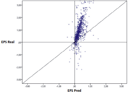 To complement this study, Figure 3 plots the dispersion diagram between real and estimated earnings. It can be seen that the observations with real positive earnings tend to be above the 45º line from the origin, meaning the real earnings tend to be greater than the estimated figures. The projections associated with real negative earnings, on the other hand, are visibly more optimistic.