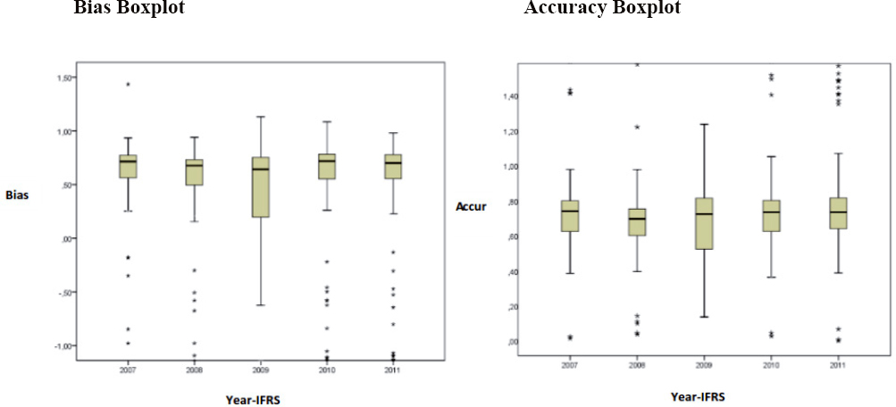 To better illustrate the concepts, we constructed the boxplots of the bias and accuracy of the estimates. These show that in average terms the measures did not significantly change during the years studied, either before or after IFRS adoption.