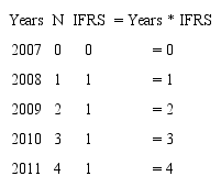 - Years x IFRS: We assigned a progressive variable to indicate the years. This choice was based on the assumption of a learning curve for working with the new standards (learning by doing). Therefore, we attributed a value of zero to 2007, the year before adoption, and then increase the value by one for each succeeding year, so that the value of 4 was attributed to 2011, after four years of experience working with IFRS. This scheme is depicted below: