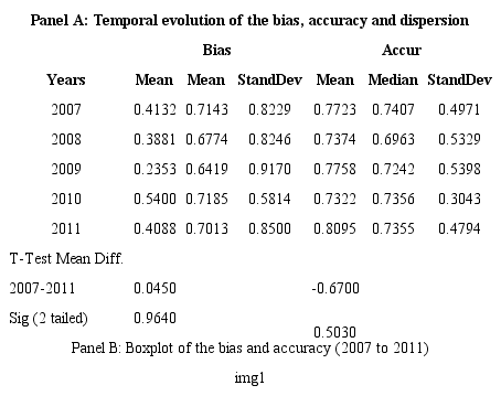 For the years from 2007 to 2011 we did not find any significant differences in terms of accuracy and bias, except for 2009, in which there was great dispersion in these metrics. A possible explanation is the difficulties faced in the process of conversion to international accounting standards that year.