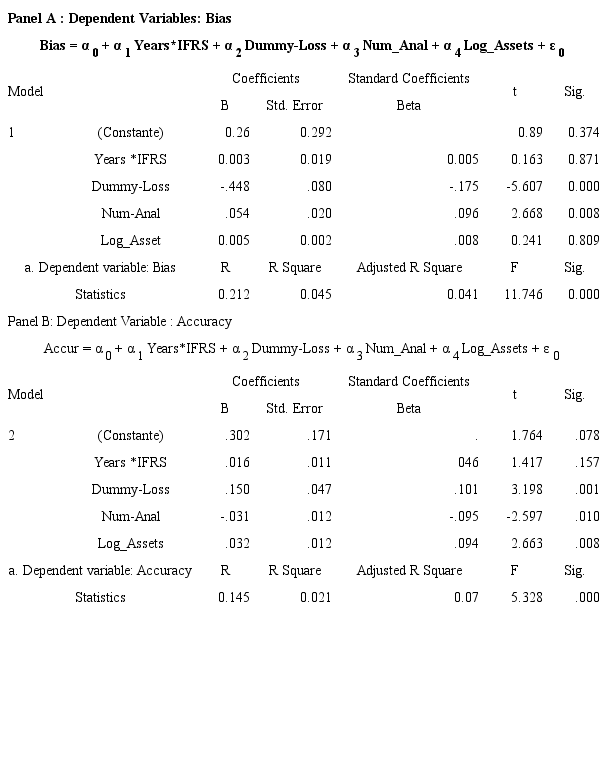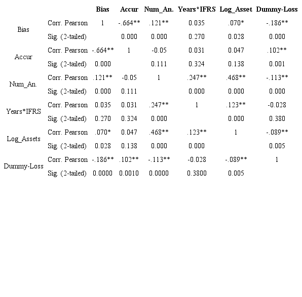 The variable Years*IFRS is positively correlated with the number of analysts and firm size. We did not find significant correlations between this variable and either accuracy or bias. As expected, with a reduction of bias, the accuracy improved. Also, bias is negatively correlated with the dummy for loss, indicating that analysts in the period were more likely to make overly optimistic and less accurate forecasts for firms that wound up losing money in the period covered by the earnings prediction.