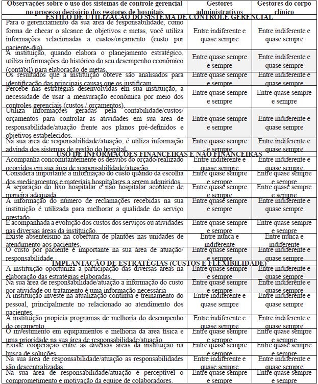 Por outro lado, os resultados da pesquisa contrariam os resultados da pesquisa de Abernethy e Brownell (1999), que indicam convergência entre o uso de informações pelos gestores médicos e gestores administrativos. Com vistas à uma visão conjunta dos resultados da presente pesquisa, no Quadro 1 apresenta- se uma síntese dos achados do estudo.