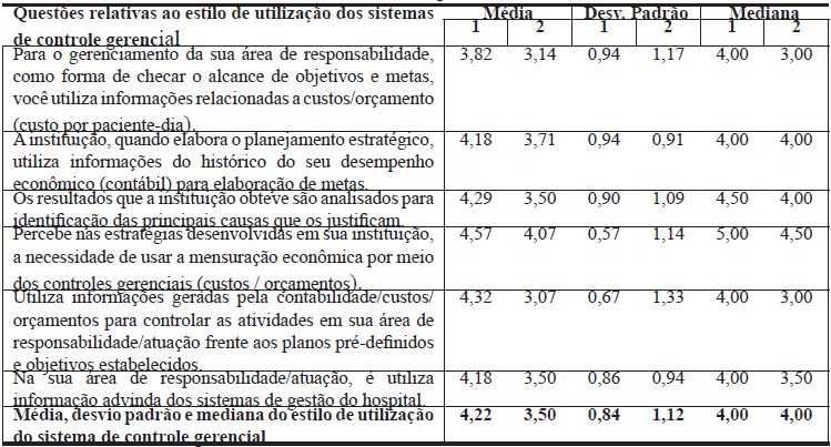 Nota-se na Tabela 6, em relação ao estilo dos gestores frente à utilização dos sistemas de controle gerencial nos hospitais, que os responsáveis pelo setor administrativo têm entre quase sempre e sempre (4,22) se utilizado das informações fornecidas pelos instrumentos dos sistemas de controle gerencial. Já a percepção de uso dos instrumentos gerenciais pelos gestores do corpo técnico ou clínico oscilou entre indiferente e quase sempre utilizado (3,50).