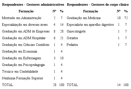 Desse modo, a amostra não aleatória da pesquisa foi assim composta: 30 hospitais responderam o questionário; em alguns o questionário foi respondido apenas pelo administrador; em outros pelo médico; e na maioria dos casos por ambos os profissionais. Em síntese, o questionário foi respondido por 28 gestores responsáveis pela administração e 14 gestores responsáveis pelo corpo técnico ou clínico.