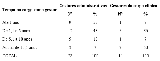 Observa-se na Tabela 2, que a maioria (32%+43%=75%) dos gestores administrativos está no cargo menos de cinco anos. Isto sugere que os gestores responsáveis pelo setor administrativo possuem bastante rotatividade na ocupação dos cargos de alta direção dentro dos hospitais pesquisados. Por outro lado, os médicos responsáveis pelo corpo técnico ou clínico tem menor rotatividade nas suas funções de alta direção. Observa-se que 57% (7%+50%) desses estão à frente do mesmo cargo a mais de cinco anos.