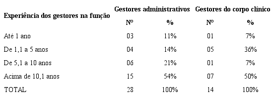 Também foi analisada a experiência dos gestores na função que ocupam atualmente. A Tabela 3 demonstra os achados da pesquisa.